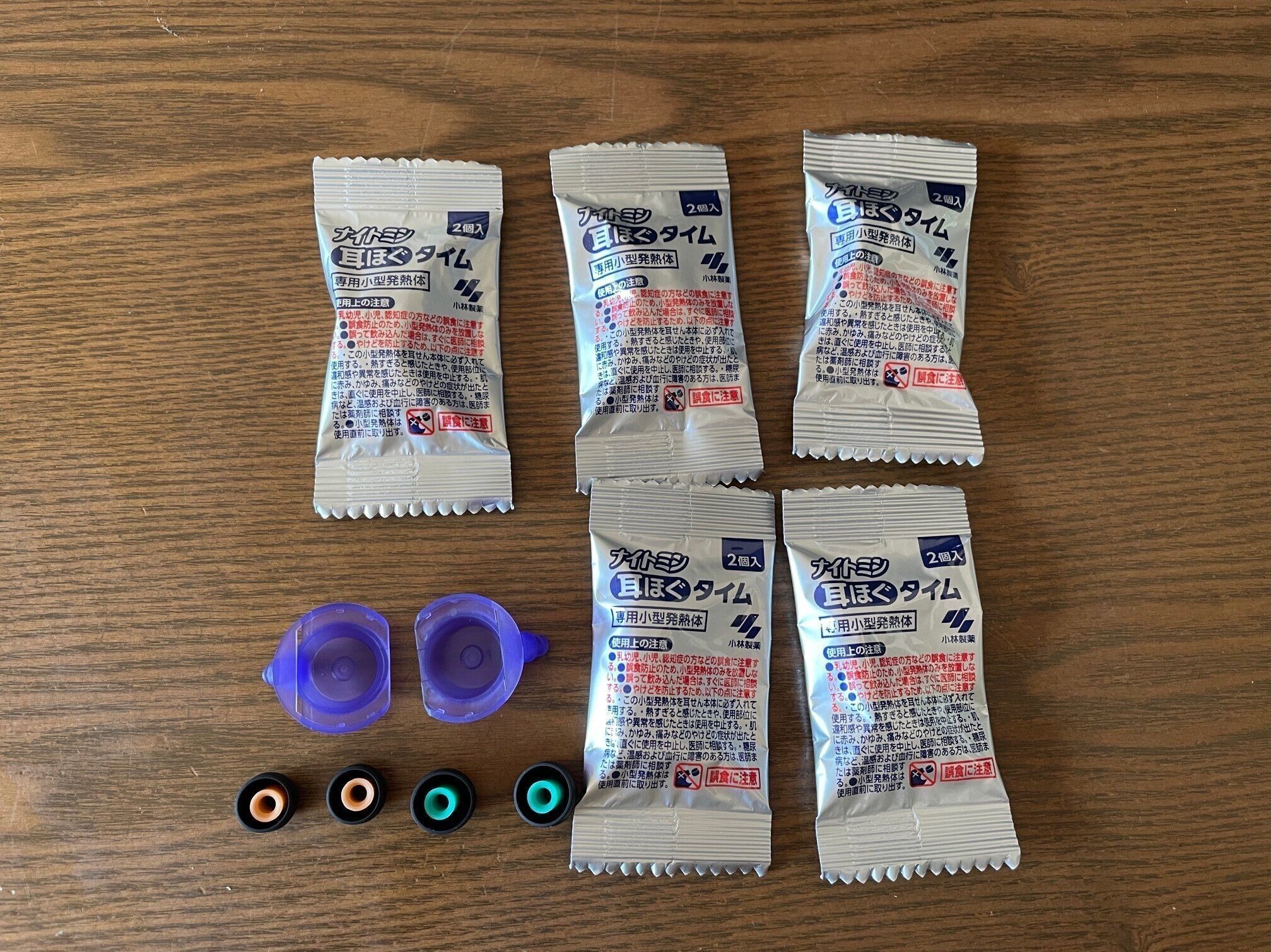 箱の中には、耳栓本体と、SとMのイヤーピースが2つずつ。そして、発熱体が5セット入っています。