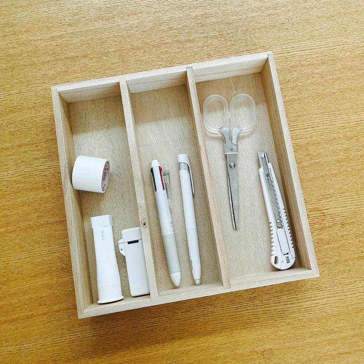 カトラリーボックスとして販売されていますが、写真のようにこまかな文具などを仕切って収納するのにも便利ですよ!