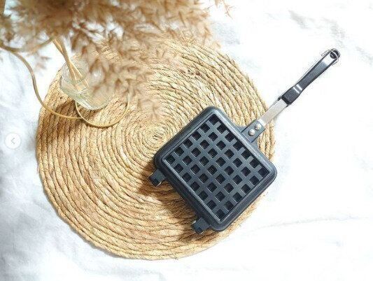 材料を混ぜてワッフルメーカーに流し込み、ふたを閉じてコンロにかけるだけ。フッ素樹脂加工なので使ったあとのお手入れも楽ちん。お家使いはもちろん、キャンプ用品としても注目されていますよ。