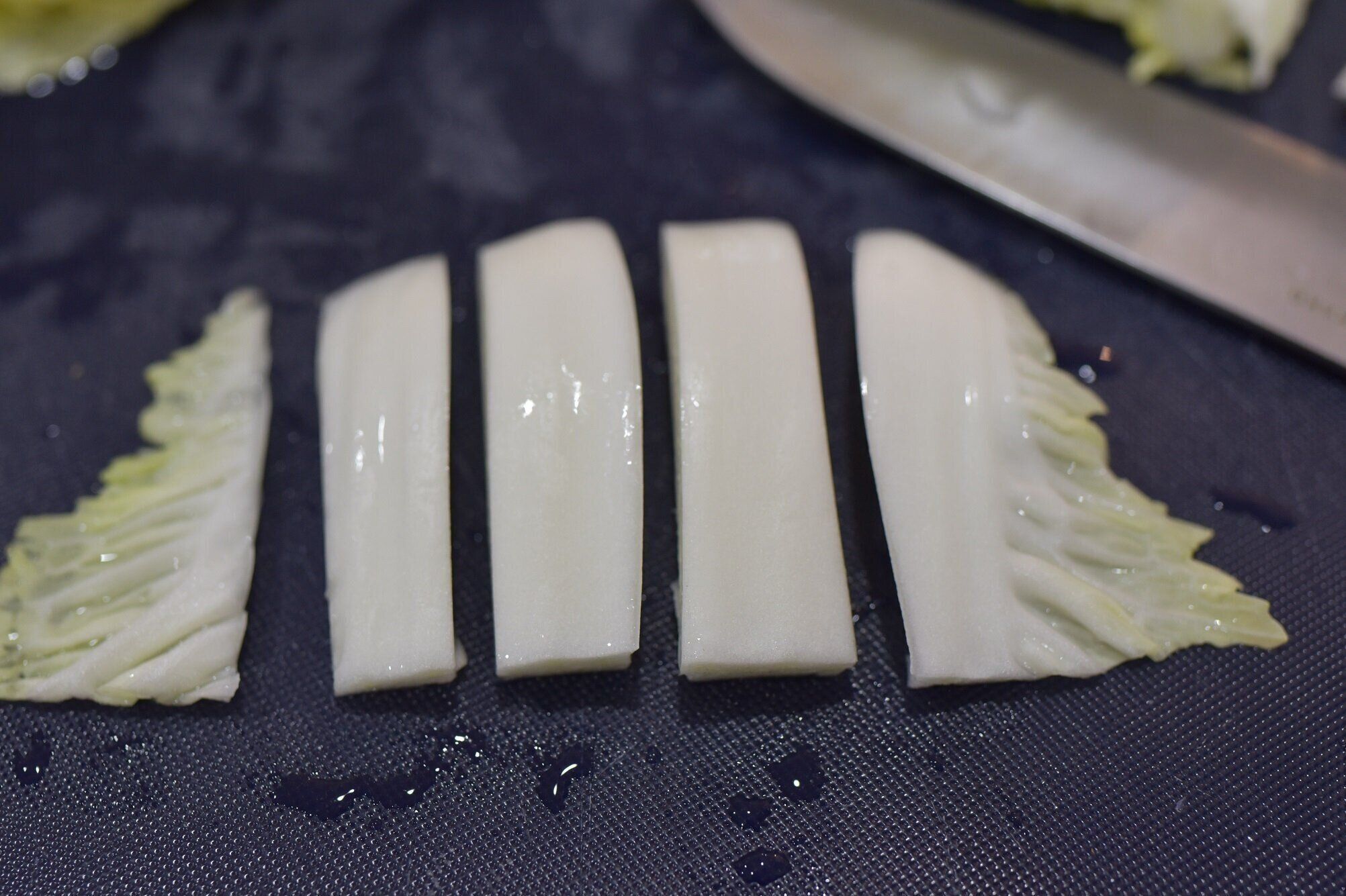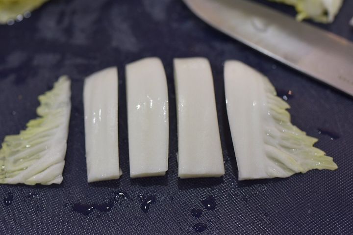 1人分の鍋を短時間でつくりたいときは、白菜の芯のように火が通りにくい食材は写真のように小さめにカットして、フライパンの底の方に入れることを意識するのがオススメです。