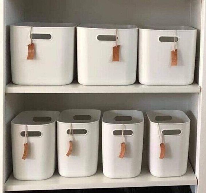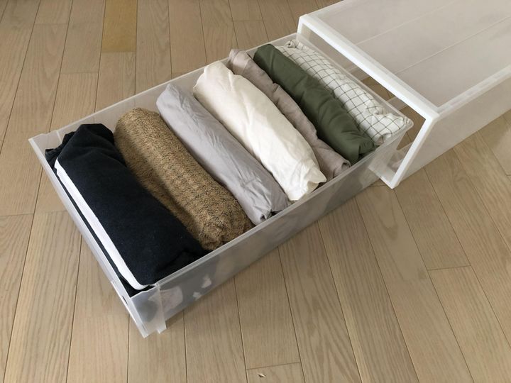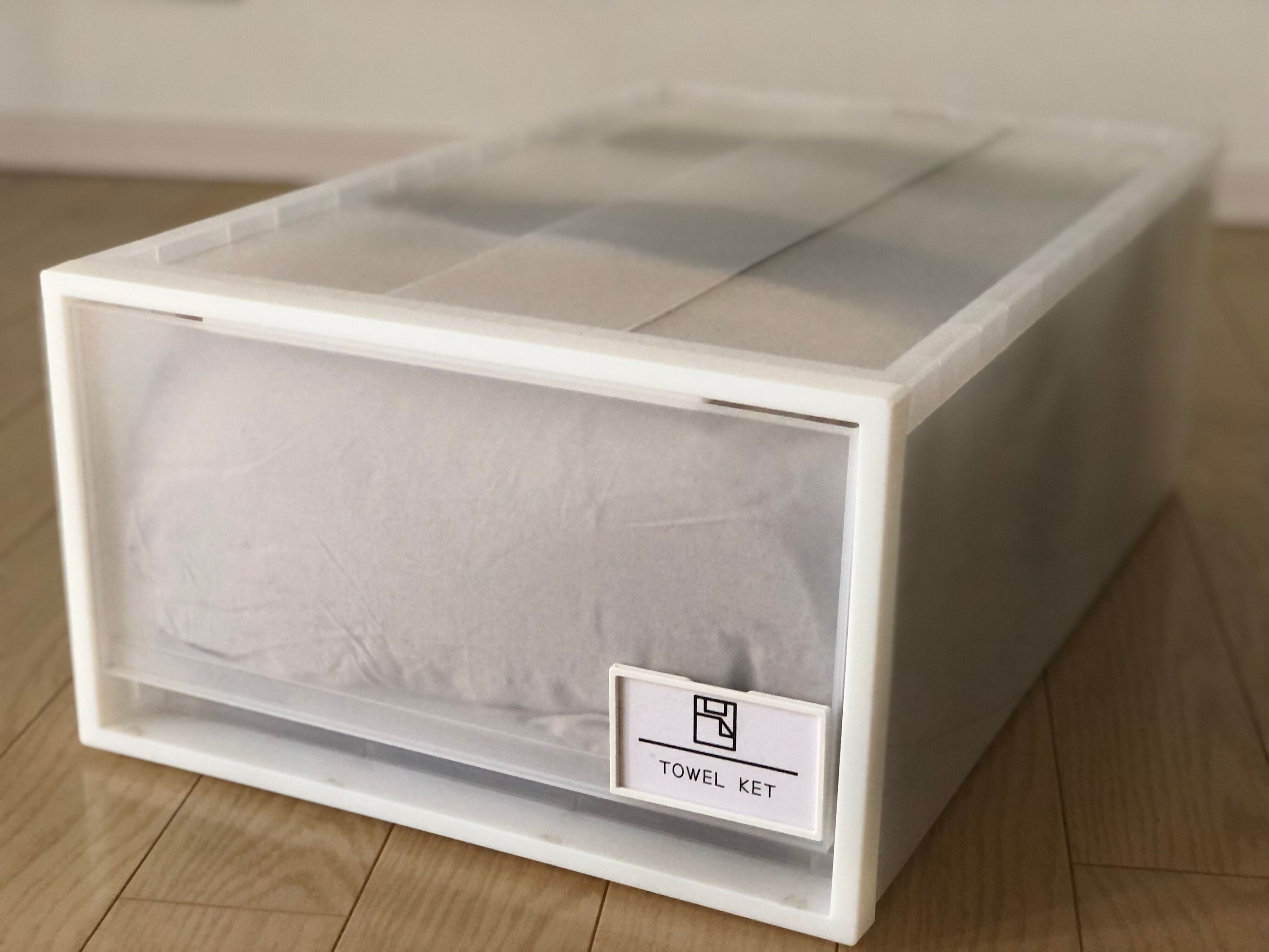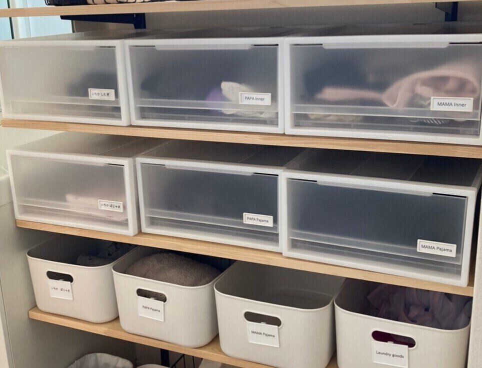 適度なサイズ感に加えて、高さもあるので下着などを目隠ししながら収納するのにピッタリ。中になにが入っているかは、取っ手部分にタグを付けて判別できるようにしています。