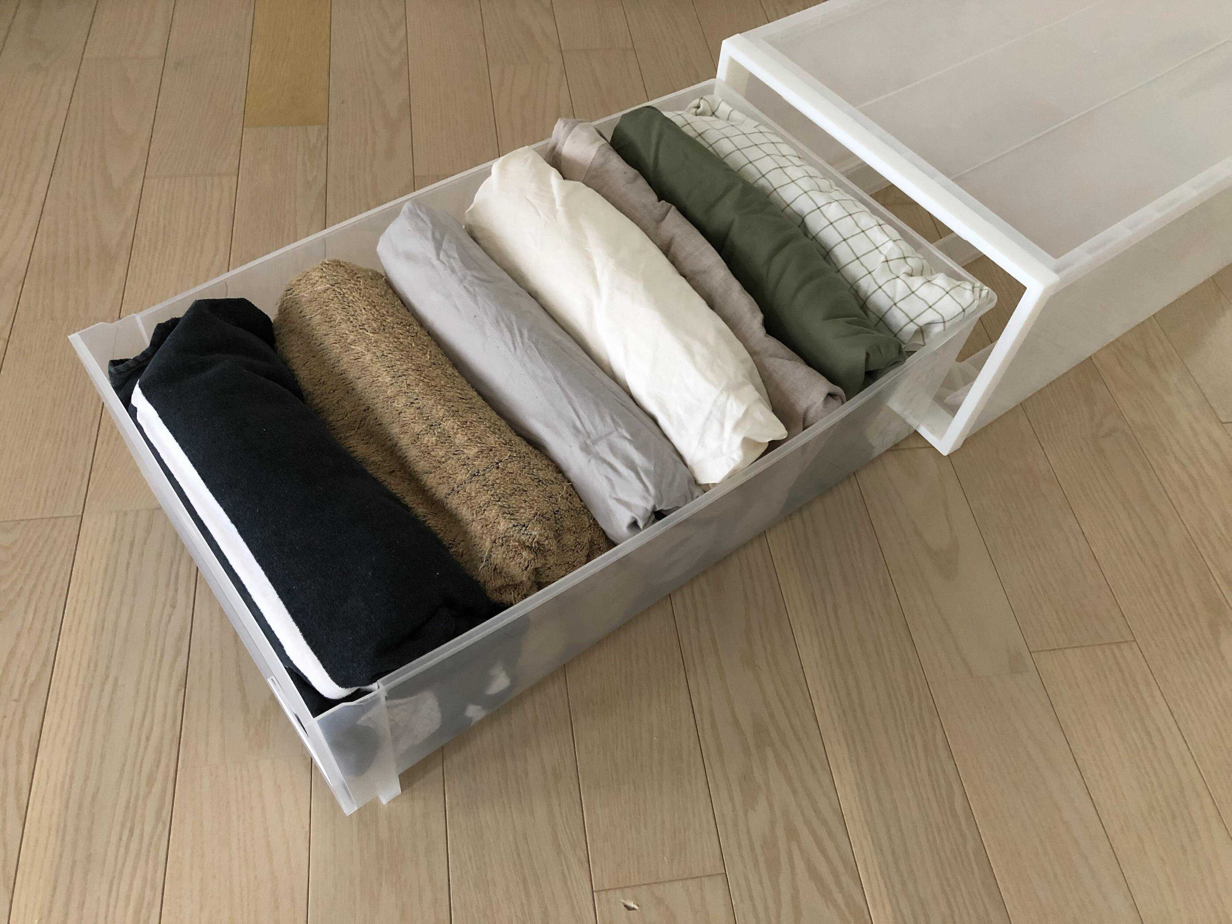 シングルサイズのシーツが5枚、タオルケットが2枚入ります。奥行が65cmあるので、押し入れに置くのちょうどいいサイズ感です。