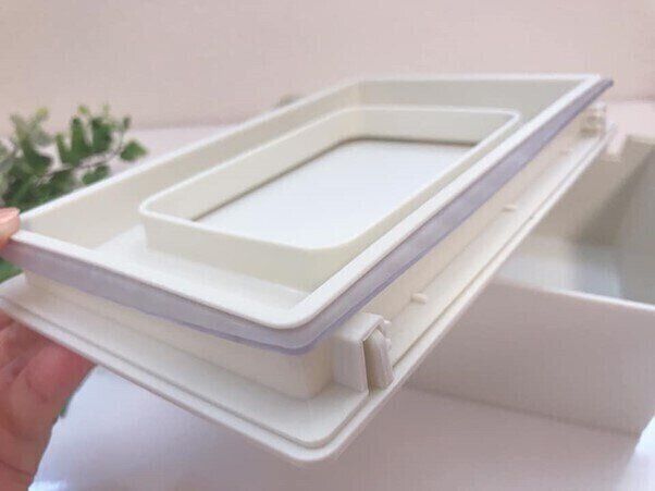 ウエットティッシュや除菌シートもピッタリ入ります。ふたの縁にはパッキンが付いているので密閉効果があり、ウエットティッシュなどの乾燥を防いでくれるし、取り出す時にふたも一緒にパカっと外れることもありません。