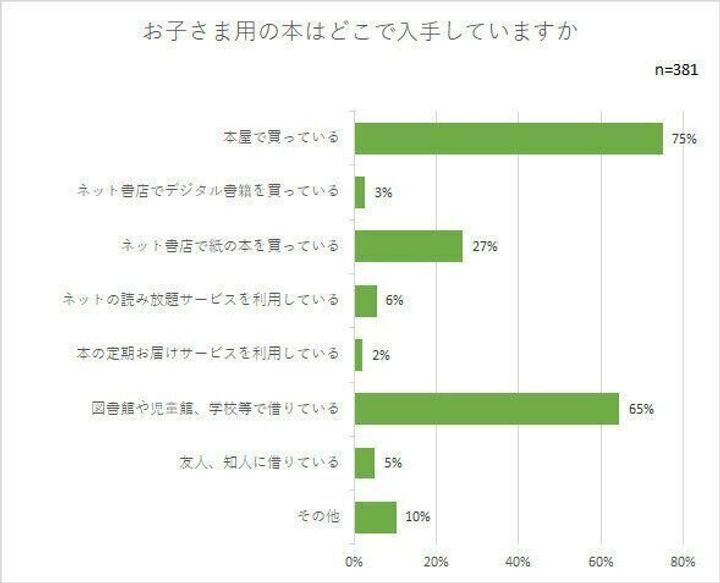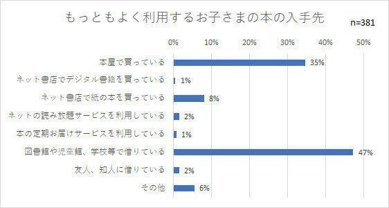 本を入手する場所を聞くと、「本屋で買っている」「図書館や児童館、学校等で借りている」との回答が圧倒的。