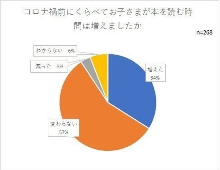 コロナ前に比べ、子どもの読書時間は変わらないと答えた人が57%でしたが、増えたと答えた人も34%と多くいました。