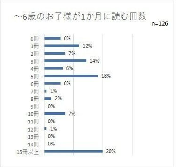 6歳以下が1カ月に読む本の数は、15冊以上がもっとも多い結果に。1~5冊ほど本を読む子どもも多いようです。
