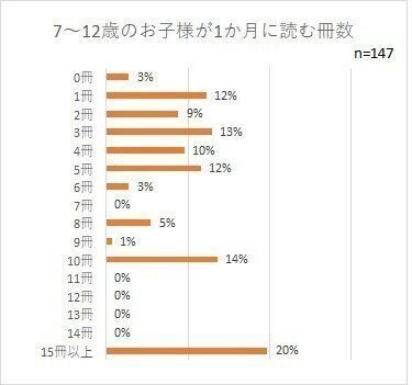 7~12歳も15冊以上本を読む子どもが多いようです。10冊以上読む子どもが34%もいることがわかりました。