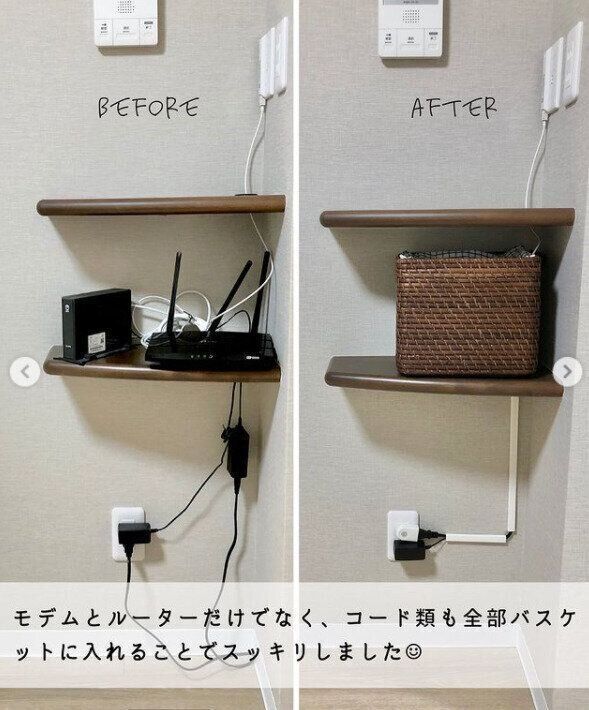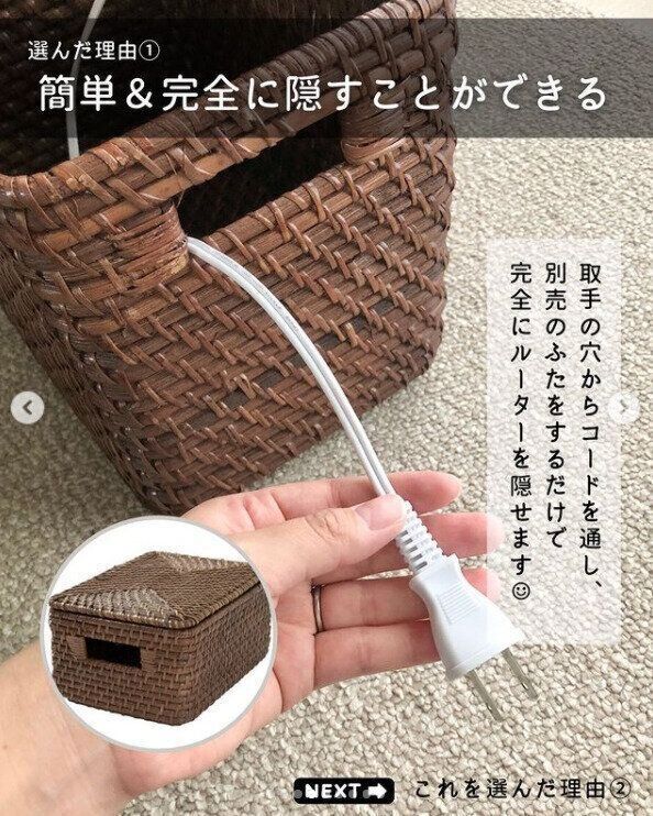 市販のルーター専用収納グッズもありますが、ルーターのサイズや場所によっては使えないこともしばしば。そのようなときにおすすめのアイテムが、「積み重ねバスケットライド2」(1,192円)になります。本来の用途ではありませんが、このバスケットであれば通気性もよいため、ルーターやモデムの熱がこもりにくく安全に収納できるでしょう。また、ナチュラルな素材のため、インテリアにもなじみやすいのが◎。バスケットの取っ手の穴からコードー類を通し、別売りのふたをかぶせればルーターを隠せてすっきり収納もできます。