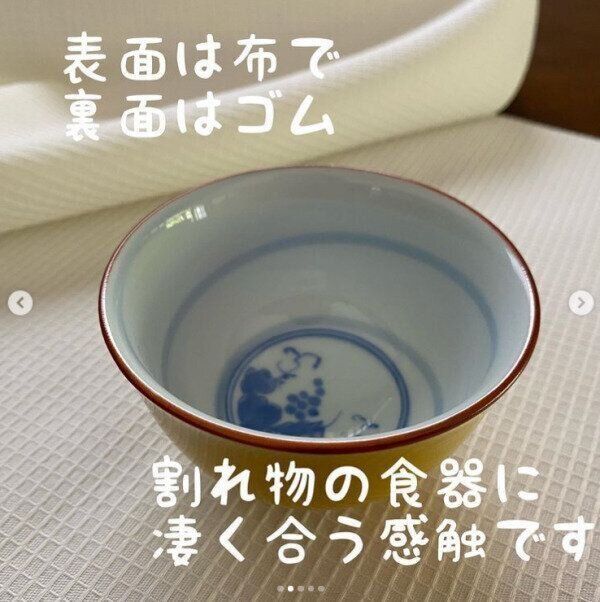 食器棚シートがふわっと浮くのが気になるという方におすすめのシートが、「布の風合いを活かした、洗濯できる食器棚シート」(712円)になります。このシートは表面は薄い布ですが、裏にゴム加工がしてあるため、棚に敷くとぴたっと吸いつくように敷けるでしょう。また、汚れても洗えるため、長く使えるのも高ポイントです。これで食器がカタカタしなくなったと評判のアイテムです。