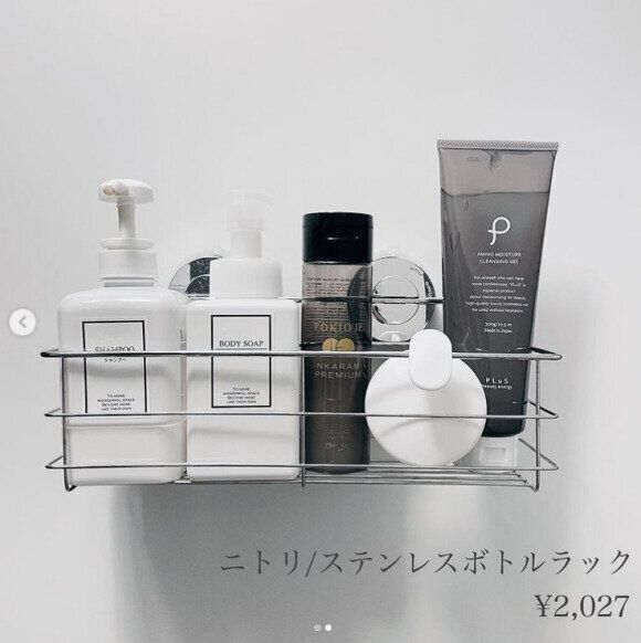浴室のボトル類の浮かせる収納におすすめのアイテムが、「ステンレスボトルラック」(2,027円)になります。100均などにもボトルラックはありますが、何と言ってもこのボトルラックは吸盤が強力なのが特徴です。また、ステンレスなので、水に強くさびる心配もなし。ボトル裏のぬめりやカビの心配がなくなったと大好評のアイテムです。