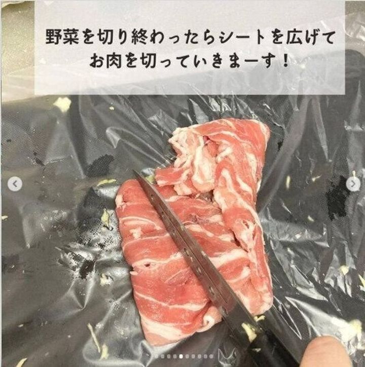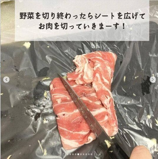 まな板の上に敷いて食材を切り、使い終わったらシートを捨てるだけ。まな板を汚れや臭いから守ってくれますよ。