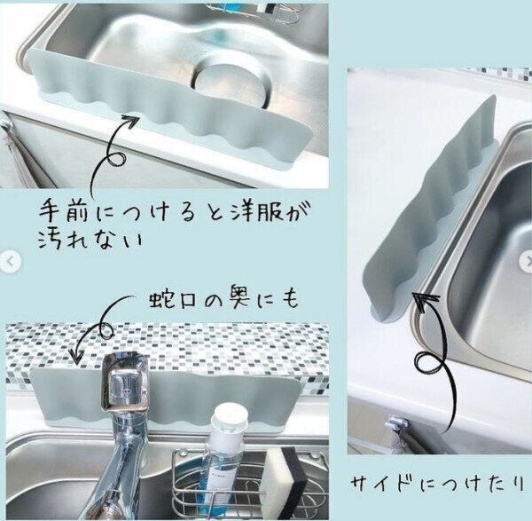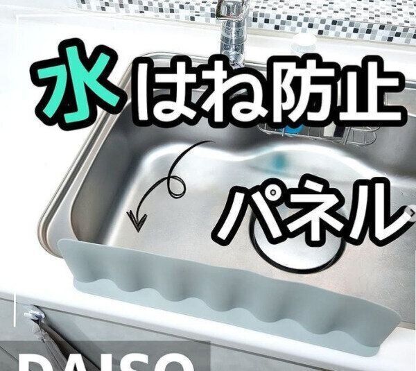 エプロンをしない人でも安心して洗いものができるアイテムの紹介です。ダイソーの「水はね防止パネル」は高さが10cmあるため、シンクの手前につけるとお腹部分が濡れることなく、洗いものができるでしょう。また、シンクサイドにつけたり、蛇口の奥につけたりと使い方はさまざま。4つの吸盤がしっかり吸着するため、倒れてくる心配もありません。「これ欲しい~」と思わず言ってしまうアイテムになります。