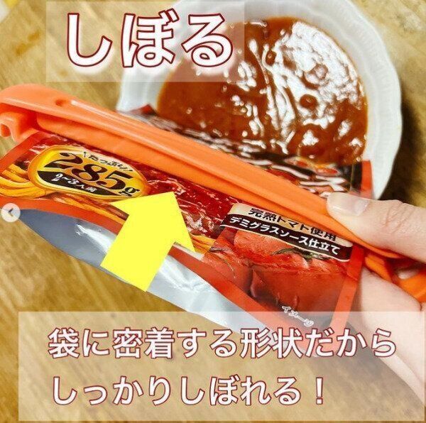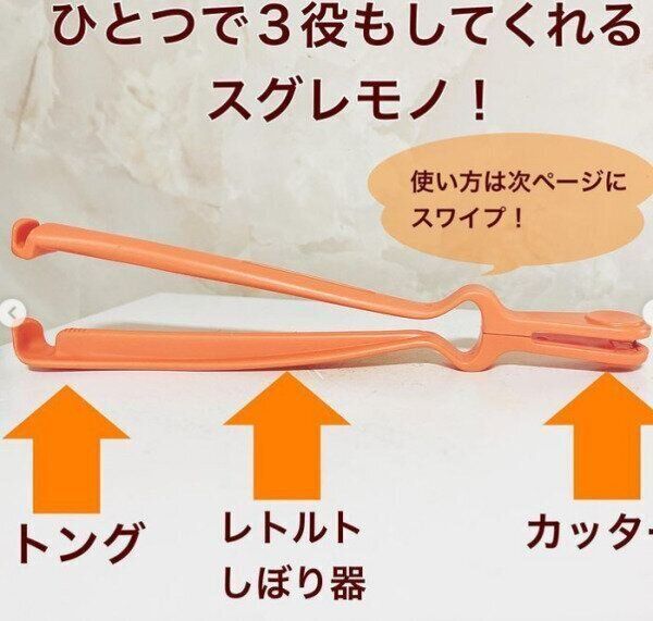 湯せんのレトルト食品を使うときに大活躍するのが、キャンドゥ「レトルトしぼり&カッター」です。これ1本でトング、レトルト絞り器、カッターがついている優れもののアイテム。湯せんしたばかりの熱々のパッケージをお鍋からトングで取り出して、カッターで開封、絞り出しまでが、これ1本で簡単にできてしまいます。熱いのを気にせずに済む神アイテムです。