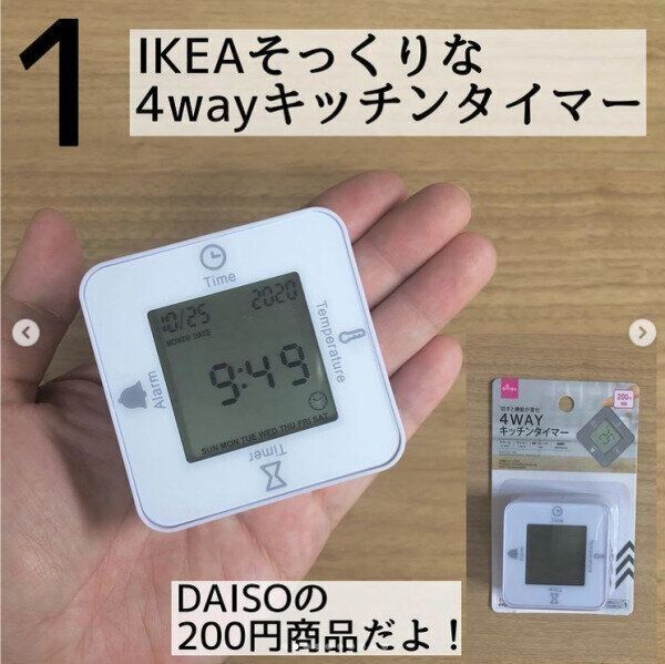 ダイソーの「4WAYキッチンタイマー」(220円)はとっても高機能。1つで時計、タイマー、アラーム、温度計の役割を果たしてしまいます。しかも、向きを変えるだけで機能を変えられるため、料理中でもさっと使いたい機能にできてとても便利です。コンパクトなホワイトのボディもとてもおしゃれ。キッチン以外の場所でも活用できそうな高コスパのアイテムです。