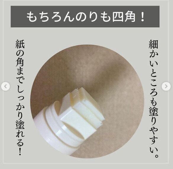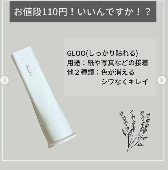 SNSでも使いやすいと話題になったアイテムがキャンドゥ「スティックのり GLOO」です。四角い形が特徴的なこのスティックのりはメリットだらけ。まず、本体が四角いため、転がりません。次に、のりも四角いため、細かいところや、紙の角まで塗りやすいでしょう。さらに、見た目もスタイリッシュで、机の上においてもおしゃれです。ついつい買ってしまいたくなるアイテムです。
