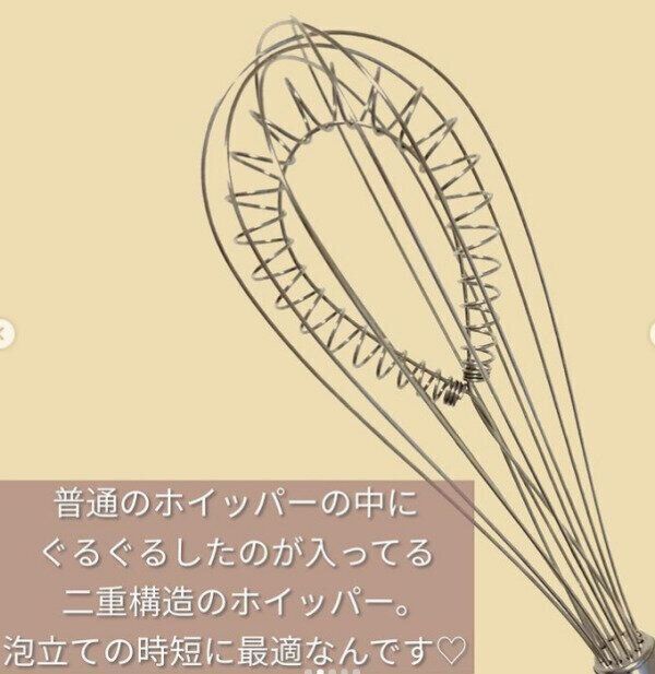 見慣れない形が特徴のホイッパーですが、ただのホイッパーではないと絶賛のアイテムです。ダイソーで販売されているこの「ホイッパー」は、普通のホイッパーの中にもう一つホイッパーがついている特殊な2重構造になっているため、泡立て時間が約1分弱短縮できるとのこと。少量のクリームを泡立てるのに、わざわざハンドミキサーを出すのも面倒ですよね。そのようなときに大活躍するのがこのアイテムです。