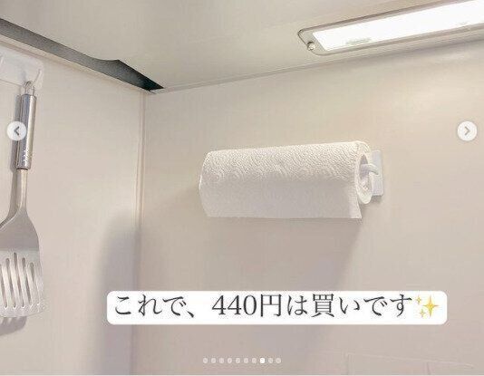 キャンドゥの「キッチンペーパーホルダー」440円。シンプルでオシャレなデザインは、100円ショップもののとは思えないと話題です。お値段も440円と超高コスパ!裏が強力な磁石になっていて、冷蔵庫やマグネット対応の壁にペタっとくっつけるだけ。キッチンペーパーをクルクル簡単に引き出せるからとっても便利ですよ。