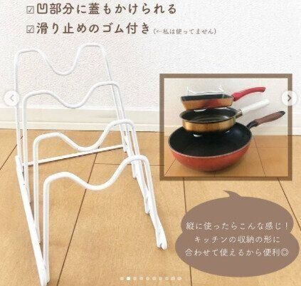 フライパンの収納に重宝するダイソーの「フライパンラック」330円。縦置きも、横置きもできるから、食器棚やシンク下など、収納する場所に合わせて使い分けられますよ。真ん中にくぼみがあり、ふたの収納にも対応。キッチン用品がきれいに並ぶと気持ちがいいですね。