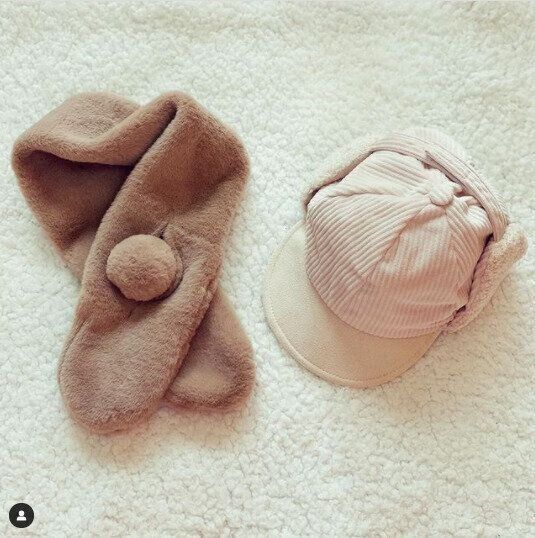 上品なベージュカラーがおしゃれなクマさんの帽子や手袋、スヌードなどはおそろいにするのもかわいいですね。ふわふわしていてあたたかそう!