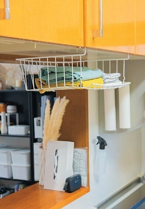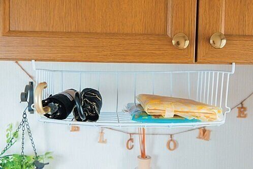 ワイヤースタックを吊り戸棚に引っ掛けて、持ち忘れがちな折りたたみ傘などは見える所に。