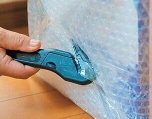 開けにくい段ボール箱は専用カッターで開封。数枚たまったら、ハンディーラップでぐるぐる巻いてポイ!