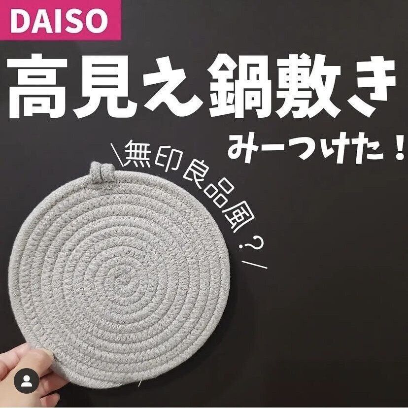 温かい食べ物を食べる機会が増える冬。鍋敷きはいくつあっても重宝しますよね。ダイソーの「綿混ロープ鍋敷き」は、110円には見えない高見え鍋敷き。1人用の鍋にしっかり対応するサイズとのこと。コロンとした丸い形がかわいいですね。持ち手がついているので引っかけて収納することが可能です。