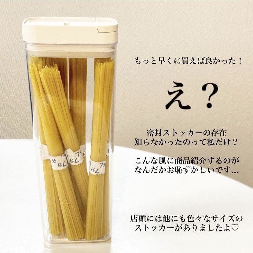 パスタ収納に便利!と話題の「密閉フードストッカー」。330円商品です。1.5Lサイズはパスタ収納に最適で、パスタを1.5kg収納することができますよ。フタの内側にはパッキンがついているため安心。サイズはこのほか、400mlと700mlがあるので用途に合わせて使い分けてもよさそうです。