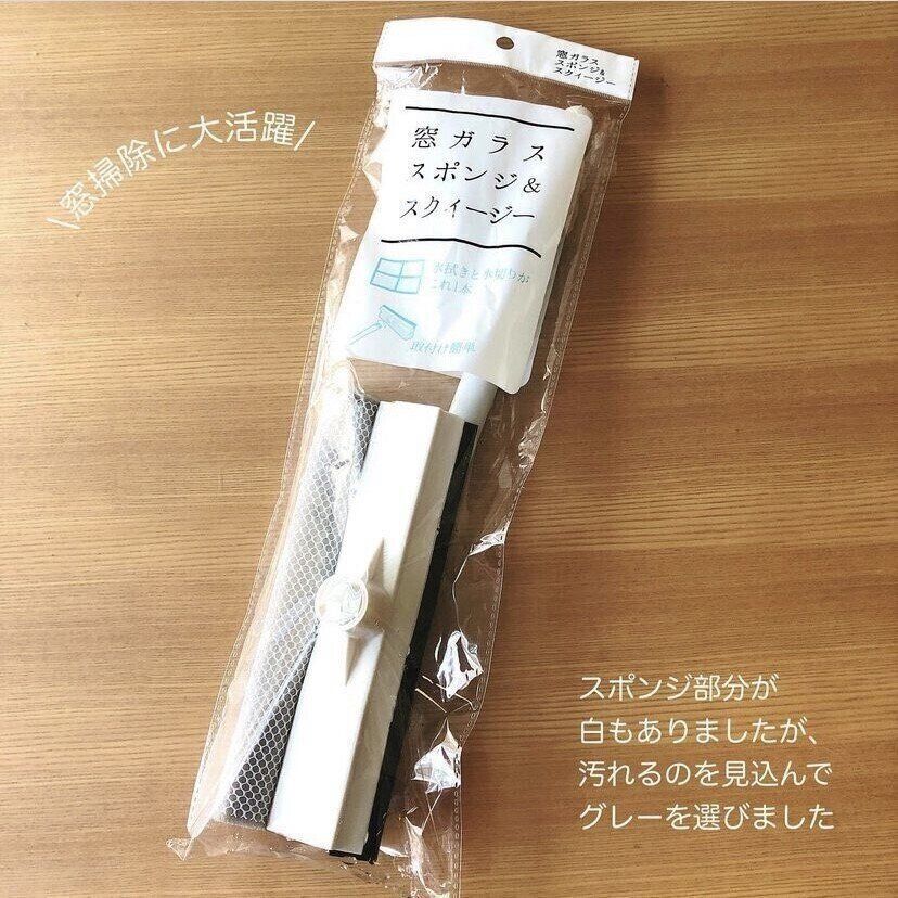 スポンジとスクイージーが一体化した「窓ガラス スポンジ&スクイージー」。これ1つで窓拭きが完結してしまう画期的なアイテムです。柄の長さは短すぎず長すぎず、持ちやすい長さのよう。水だけで窓ガラスの汚れが落ちて感動するかた続出中!110円商品とコスパも最強です。