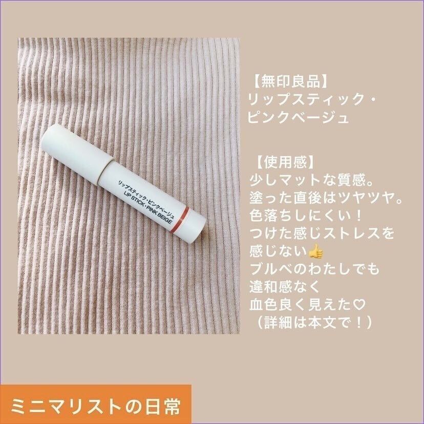色落ちしにくい!とSNSで評判の、無印良品の「リップスティック」。750円の商品です。4色展開で、どれも顔馴染みのよいカラーばかり。滑りがよくスルスルと塗れ、血色のよいうるおい感のある仕上がりになるそう。余計なものが入っていないので、つけても唇がヒリヒリしたり重くなったりしないところも人気の理由のひとつです。