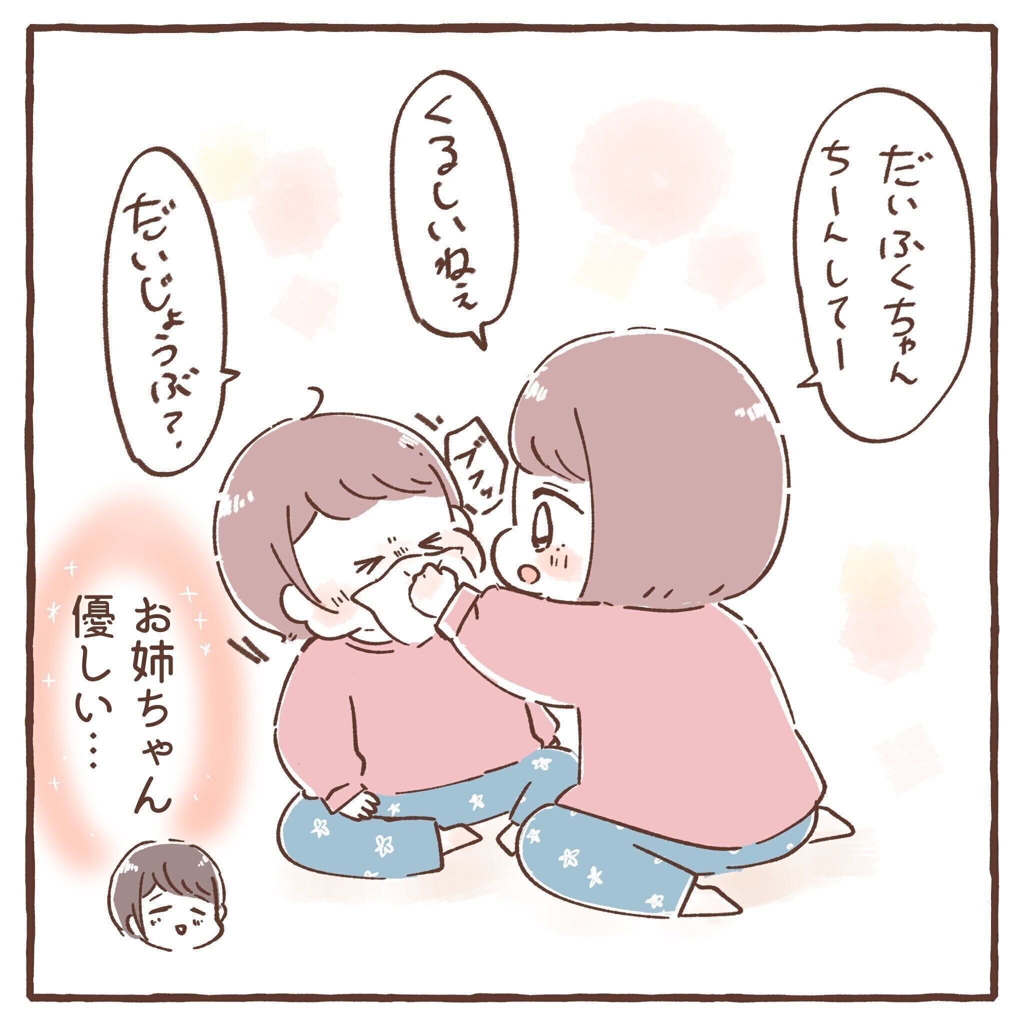 つらそうな妹に「だいふくちゃん、ちーんしてー」と言いながらティッシュで鼻をかませ、かいがいしくお世話するおはぎちゃん。「くるしいねぇ」「だいじょうぶ?」と気づかう様子は、とても4歳とは思えないほどしっかりしていて、優しさにあふれていますね。