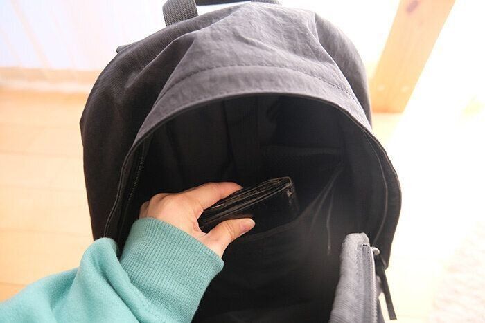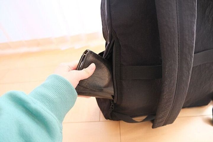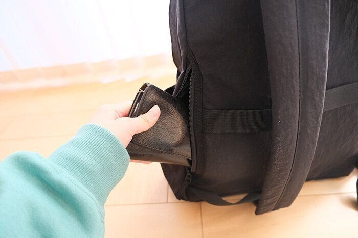 リュックサックの大きな口からもお財布の取り出しができます。じつは内部でお財布を入れたポットが繋がっているのです…!