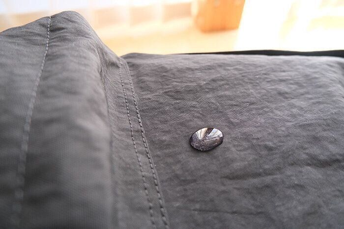 適当に自宅で水滴を垂らしてもこの弾きよう!撥水加工もかなり本格的です。中に電子機器を入れていたとしてもこれぐらいしっかり撥水してくれればかなり安心できますね。