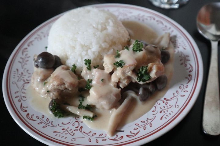 シュクメルリとは、ジョージアの伝統料理で一見ふつうのホワイトシチューに見えますが、チーズとニンニクがガツンときいており、深みのある味わいが特徴。