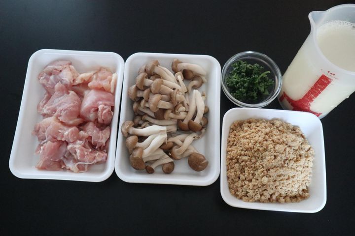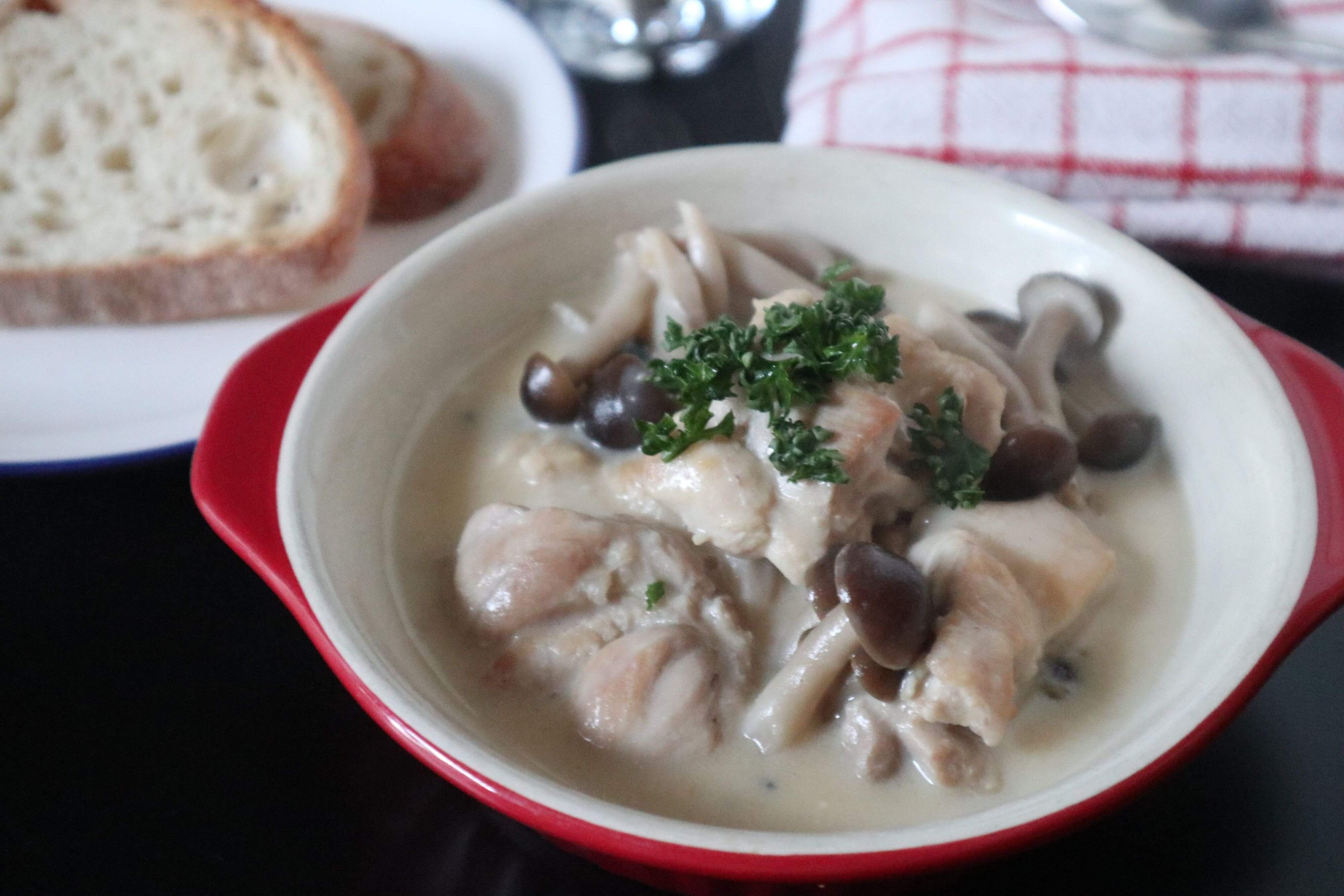 1.鍋を中火にかけてオリーブオイルを加えて、鶏肉を両面こんがり焼く。水、しめじを加えて鶏肉に火が通るまで煮る。