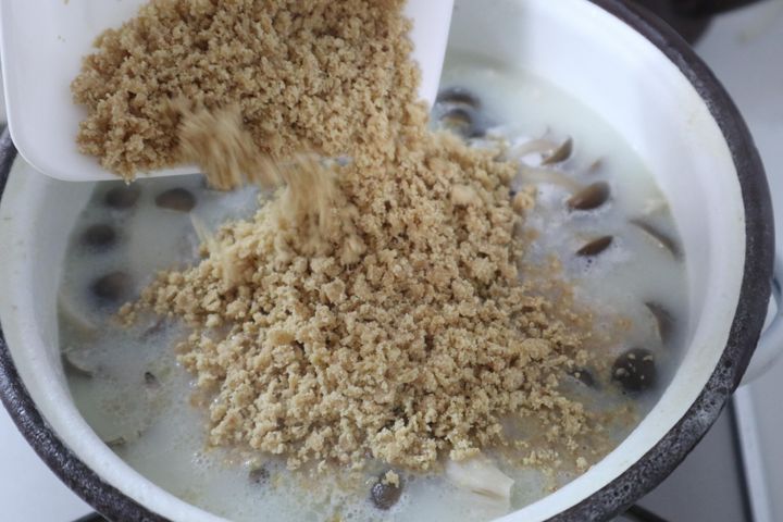 2.1の火を止めて豆乳、シュクメルリを加えて混ぜる。弱火にかけて、とろみがつくまで混ぜる。