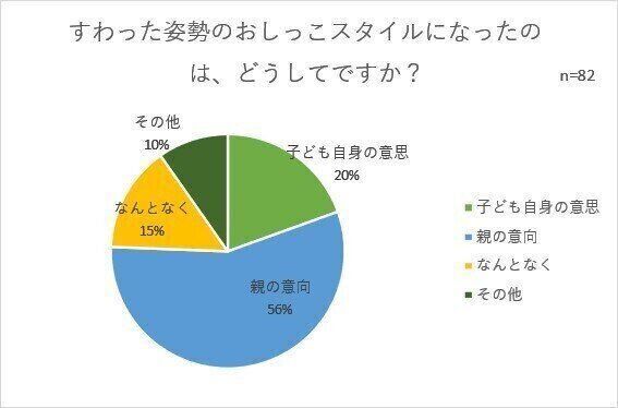外出先では立ってする機会のほうが多そうですが、家ではなぜ座ってするようになったのか気になりますよね。これについての質問では、"親の意向"と答えた人が56%と半数以上でした。