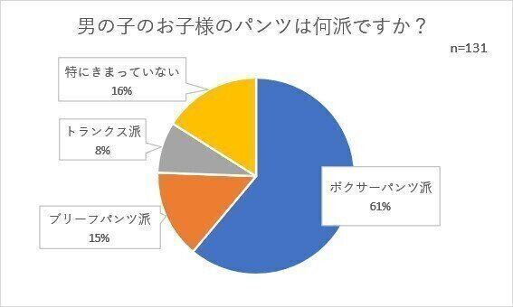 家庭や外出先でのおしっこスタイルを踏まえたうえで、"男の子のお子様のパンツは何派ですか"と質問をしたところ、「ボクサーパンツ派」が61%で、ほかの回答を大きく引き離しました。