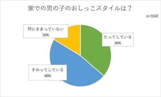 男子のいるご家庭160人に、"家での男の子のおしっこスタイルは"と質問をしたところ、「すわってしている」と答えた人は76人で48%と半数近くいました。