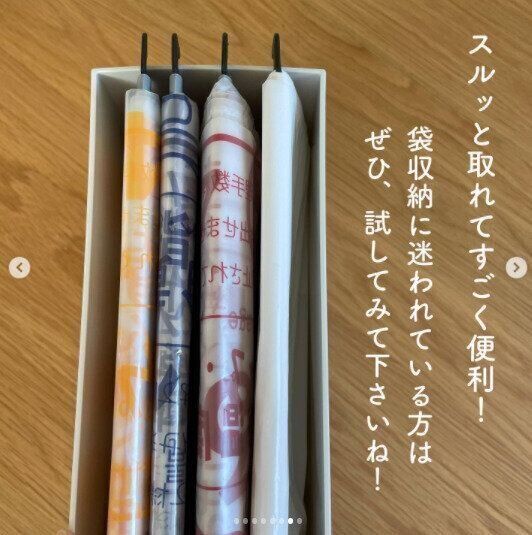 ゴミ袋を種類ごとに分けて引っかければ、便利なゴミ袋収納に。これなら、ゴミ袋を1枚1枚簡単に取り出せて、とっても便利ですね。