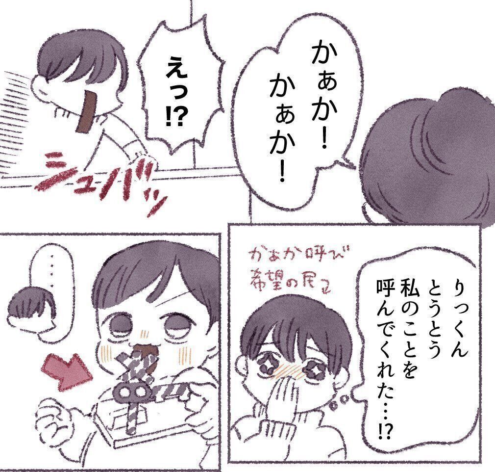 ある日、息子のりっくんの「かぁか!かぁか!」という声が聞こえたとたん、驚いてりっくんのもとにかけつけたあむちさん。「とうとう私のことを呼んでくれた…!?」と、感激している様子です。