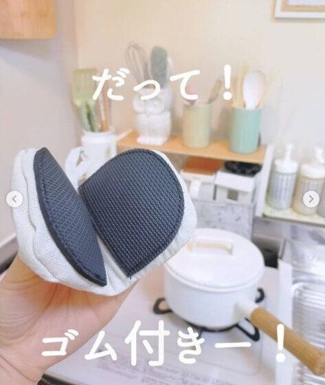 シンプルなのにハイクオリティで思わず即買いしてしまったという、セリアの「耐熱ゴム付きミニミトン」を紹介します。このミトンのすごいところは、なんと言っても厚めのゴムがついているところ。耐熱のため、熱いふたも躊躇せず開けられます。また、ミトン自体もふかふかしているため、フィットしてつかみやすいのがうれしい点です。さらには、無地でホワイトという主張しない見た目もナイス。汚れたら気軽に買い替えられるリーズナブルさも高ポイントです。