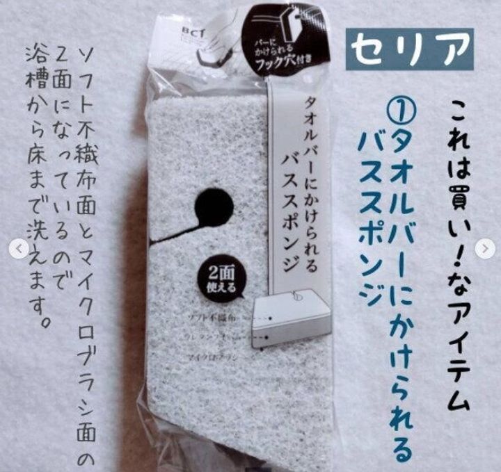 110円なのにかなり優秀だと評判のアイテムが、「タオルバーにかけられるスポンジ」です。このスポンジの特徴は、中央の切れ込み。この部分がタオルバーにかけられるようになっています。また、尖った形状のため、水切れもばっちりです。カラーはホワイトとグレーのモノトーンになっていて、スタイリッシュ。2種類のスポンジがついているため、これ1つで浴槽から床まですべて洗えてしまう優れものです。手ごろな価格のため、リピ買いする人も多いスポンジになります。