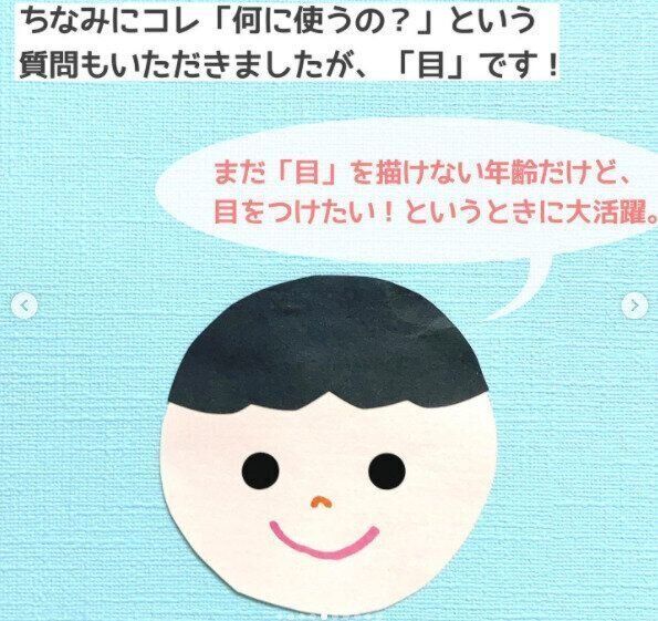 小さな子どもといっしょに折り紙や紙工作をしたときに、動物や人の顔など、目を描くときも多々ありますよね。けれども、まだ目がうまく描けない年齢の場合は、結局大人が顔部分をつくってあげないといけないこともしばしば。1つや2つなら大したことはありませんが、大量の場合だとかなり大変な作業になってしまうでしょう。