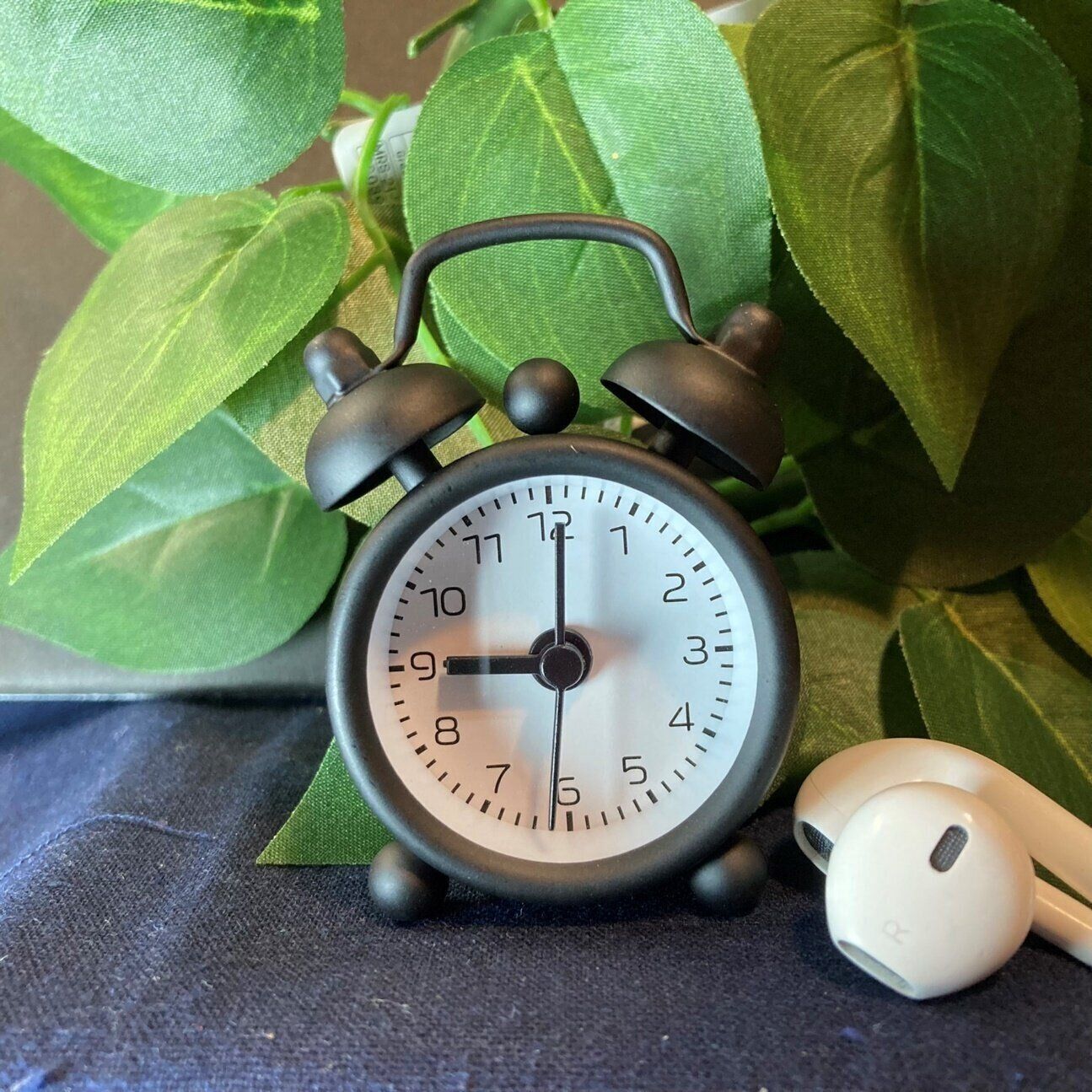 目覚まし時計が壊れたので、ダイソーで探してみつけたのが、この「ミニ目覚まし時計」。「ザ・目覚まし時計」風な定番デザインなのに、サイズは極小サイズです。高さはわずかイヤホンのイヤーピース3個分!