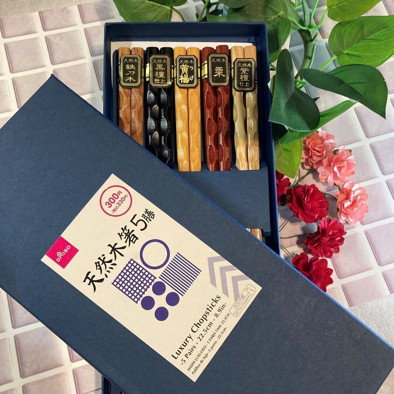 一目惚れしたダイソーの「天然木箸5膳」は、5膳入ってお値段は330円。驚いたのは、5膳のお箸の素材がすべて違うのです。