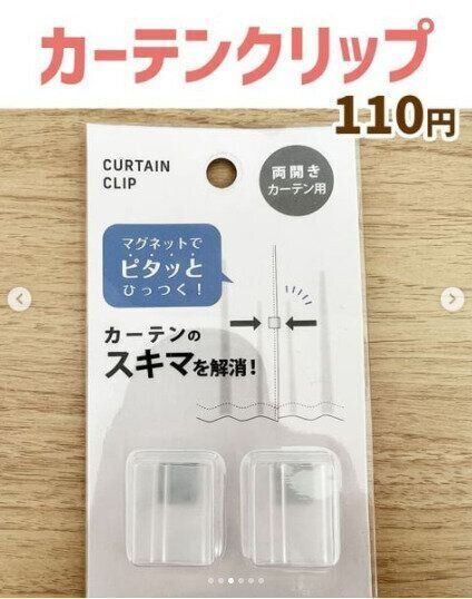 そんなときにおすすめなのが、セリアの「カーテンクリップ」。マグネットでカーテンの隙間をピタッとくっつけてくれますよ。クリップタイプになっていて、カーテンに差し込むだけでOK。取り付けや取り外しも簡単だから、自由に場所も変えられますよ。