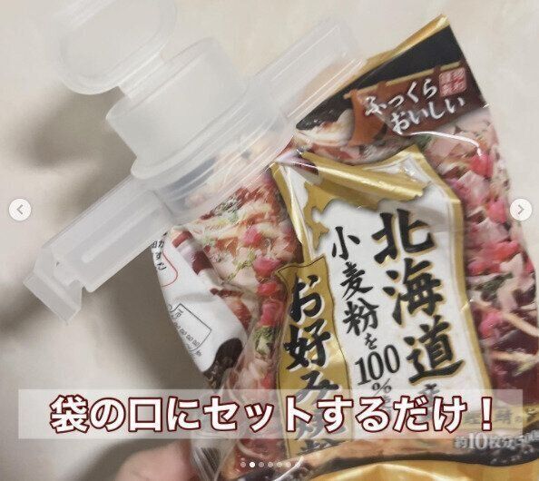 粉物などは、袋を一度開けるとその後の保存が難しいですよね。そんなときはダイソーの「キャップ付き 袋用クリップ」110円がおすすめ。開けた袋の口にセットするだけで、開けた粉物の扱いがぐっと楽に。次に使うときは、キャップのフタを開ければ中身をきちんと出すことができますよ。