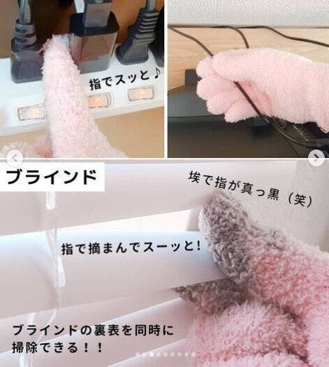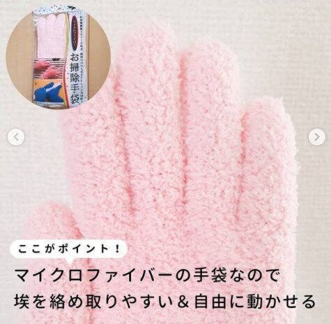 マイクロファイバーでできたダイソー「お掃除手袋」110円。手にはめてお掃除すれば、マイクロファイバーがほこりをしっかりと絡め取ります。