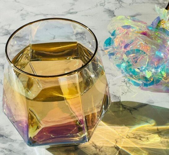 ダイソーの「グラスカップ」は、六角形のオーロラグラス。光があたるといろいろな色がキラキラと光ります。ゴールドの淵も豪華で素敵ですよね。これで330円なんて、さすがダイソーですね!