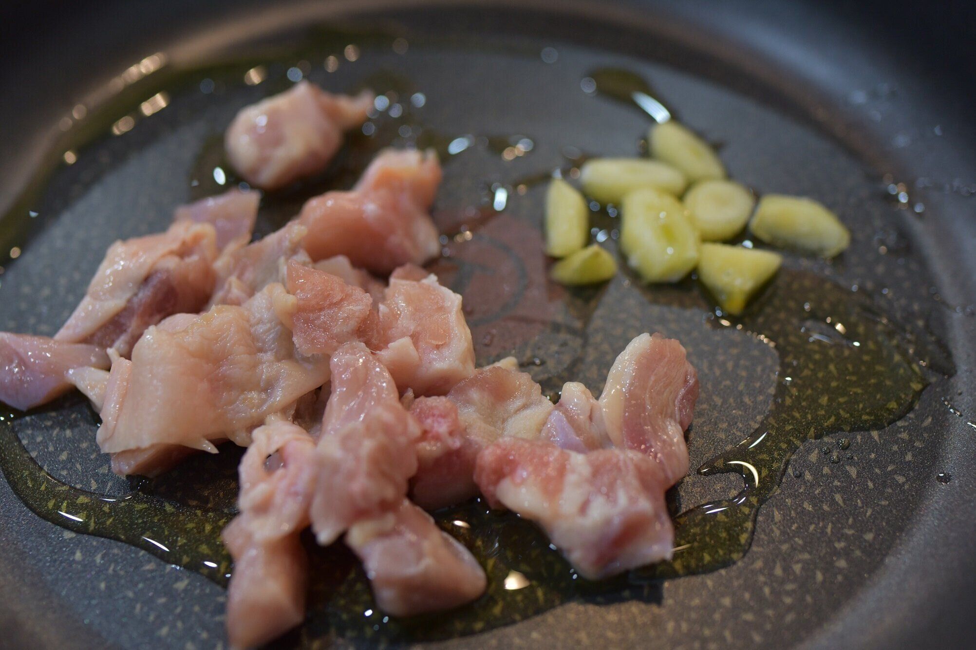まずは油をひいたフライパンで、小さめにカット(ズッキーニやナスと同じくらいのサイズ)した鶏もも肉とスライスしたニンニクを炒めます。ここでお肉に塩コショウをしておきます。